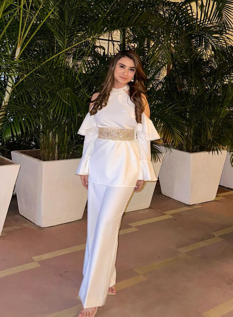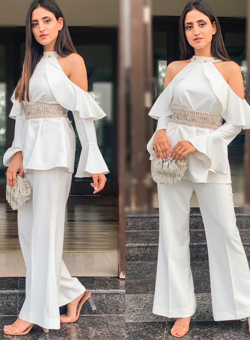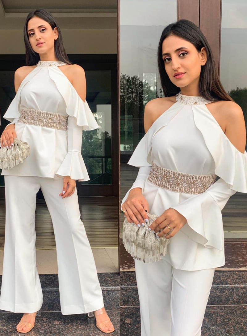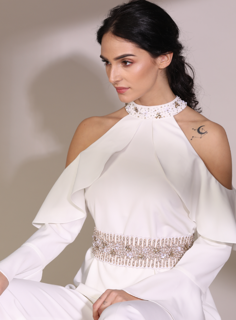White cold shoulder set with embroidered belt and flared pants