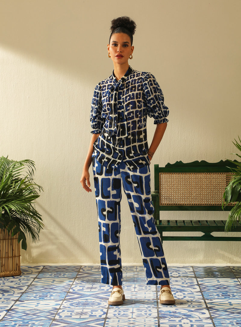 Indigo Tie Up Neck Shirt with Short Sleeves.